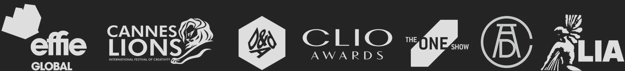 Global: D&AD, Cannes Lions, The One Show, Clio Awards, London International Awards, Art Directors Club, The Andy Awards, Effie Awards, The New York Festivals, Epica Awards, Cresta Awards, Webby Awards, Lovie Awards, Communication Arts, Mad Stars, The Drum, The Golden Award of Montreux, The Caples, Kinsale Sharks, Lisbon Awards, The Mobius Awards, AME Awards, PHNX Awards, Young Guns, DandAD New Blood, Future Lions. Regional: Eurobest, Dubai Lynx, Effie Latam, El Ojo, Golden Drum, White Square, ADC*E, El Sol, Fiap, Kiaf, The Lories, Piaf, Red Apple. Local: Digital Communication Awards, Brazilian Creativ Club, ADC Germany. Effie Germany. + Among Others